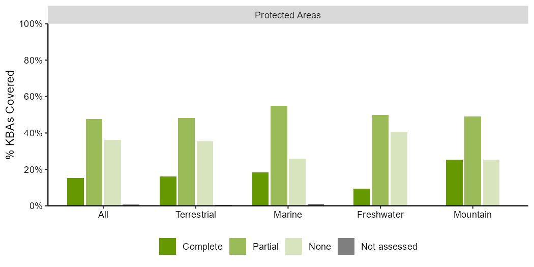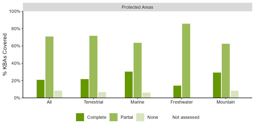 Figure 5. Protected Area and OECM coverage of all KBAs (N=235), IBAs (N=77) and AZEs (N=48). Complete (> 98% coverage) = dark green, Partial = bright green, None (< 2%) = light green, Not assessed = grey.