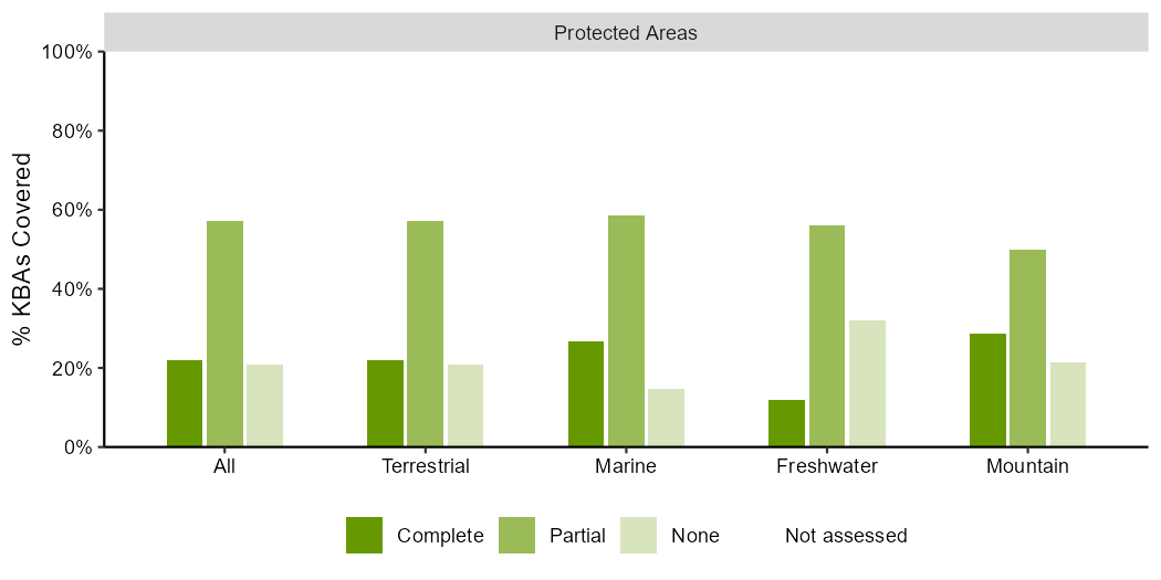 The graphs in Figure 5, Figure 6 and Table 8 display the degree to which KBAs are covered by Protected Areas and Other Effective Area-based Conservation Measures (OECMs). These data are presented to illustrate the status and gaps in protection of important sites for biodiversity, and to inform prioritization of the establishment or expansion of Protected Areas, OECMs or other biodiversity management approaches.