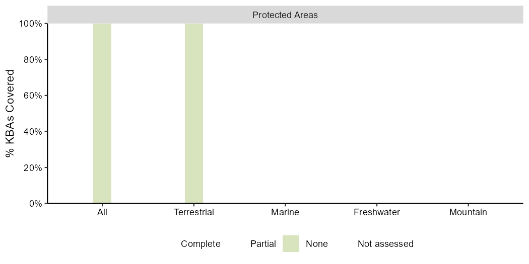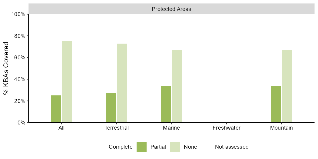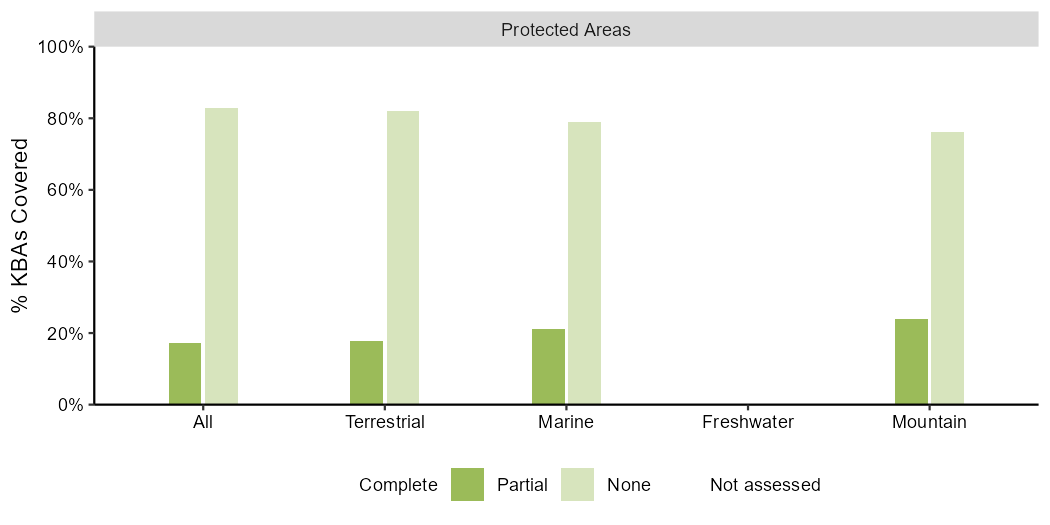 The graphs in Figure 5, Figure 6 and Table 8 display the degree to which KBAs are covered by Protected Areas (and Other Effective Area-based Conservation Measures for the very small number of countries so far that have reported them to the World Database of Other Effective Area-based Conservation Measures). These data are presented to illustrate the status and gaps in protection of important sites for biodiversity, and to inform prioritization of the establishment or expansion of Protected Areas or other biodiversity management approaches.